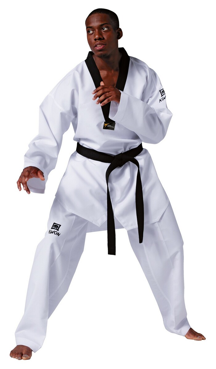 Dobok Taekwondo Revolution fait d’un tissu révolutionnaire de polyester 100 % avec structure spécifique pour le Taekwondo tissé dans le matériel. Il s’agit d’un matériel étant 50 % plus léger que d’autres matériaux à séchage rapide qui ne colle pas au corps. Par la coupe droite et les broderies du logo simples et élevées, le dobok devient déjà maintenant Disponible seulement avec col noir.